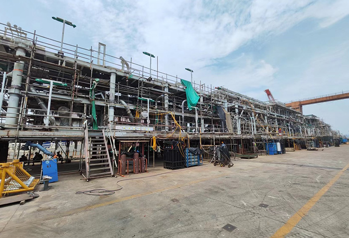 For P80 and P83 projects, the work scope of CIMC Raffles includes the FPSO hull and living quarters. The daily processing capacity reaches 225,000 barrels of oil, the oil storage capacity is 1.6 million barrels, and the natural gas storage capacity is 1 million cubic meters. The project is one of Petrobras' s largest FPSOs. The hull is 345.3 meters long, 60 meters wide, and has a total weight of 90,000 tons. It is the one of largest FPSO projects constructed in China.
