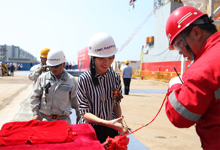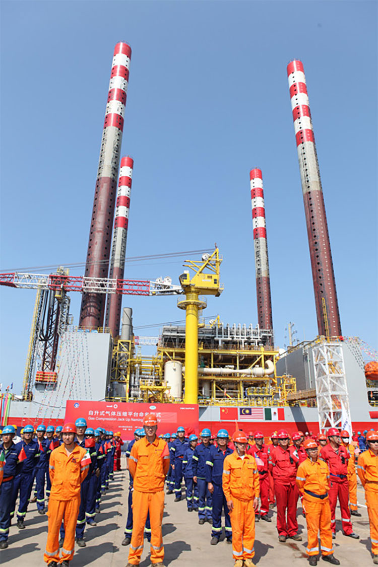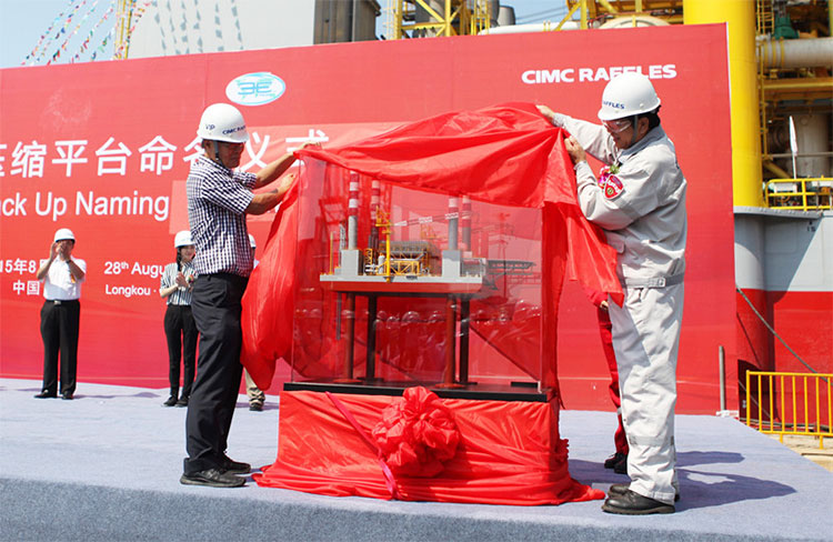 2015年8月28日上午,中集來福士為馬來西亞沿海工程公司(Coastal Contracts)自主設計建造的自升式氣體壓縮平臺AGOSTO-12在龍口基地命名,近日將開赴墨西哥海域作業(yè)。