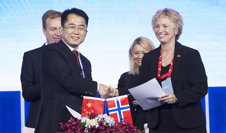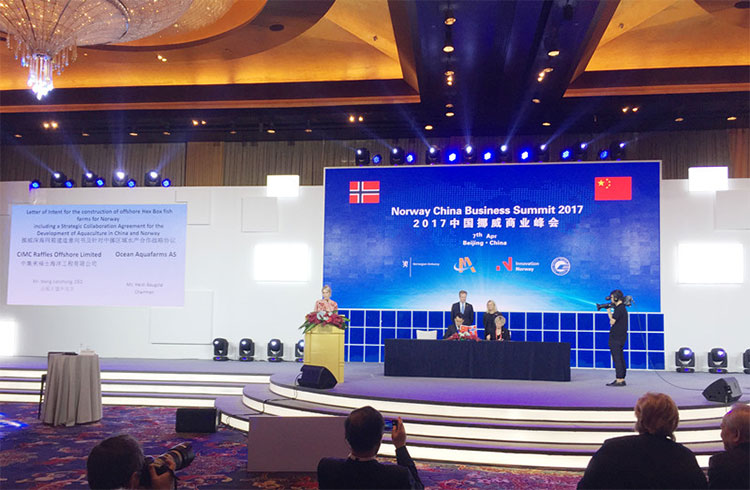 峰會(huì)上,中集來福士總裁王建中與挪威Ocean Aquafarms AS公司董事長Heidi Baugstø簽署了《挪威深海網(wǎng)箱建造意向書及針對(duì)中挪區(qū)域水產(chǎn)合作戰(zhàn)略協(xié)議》,涉及5座Hex Box養(yǎng)殖網(wǎng)箱建造,潛在價(jià)值高達(dá)2.5億美元。挪威首相索爾貝格及全國政協(xié)副主席王欽敏共同見證了協(xié)議簽署過程。