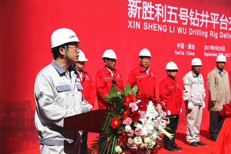 2017年9月20日上午,中集來福士煙臺(tái)基地一號(hào)碼頭鑼鼓陣陣、彩旗飄揚(yáng)。中集來福士為中石化總裝建造的新勝利五號(hào)自升式鉆井平臺(tái)順利舉行交付儀式。中石化石油工程技術(shù)服務(wù)有限公司副總經(jīng)理左堯久、中石化集團(tuán)公司發(fā)展計(jì)劃部副主任劉會(huì)友、中石化海洋工程有限公司韓來聚、中石化海洋石油工程有限公司海洋鉆井公司黨委書記、經(jīng)理許軍富、中國船級(jí)社總部海工檢驗(yàn)管理處處長(zhǎng)朱琪、中集來福士總裁王建中、中集來福士副總裁趙暉等參加了此次儀式。