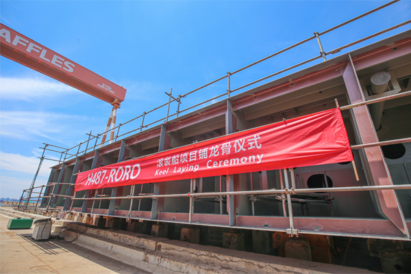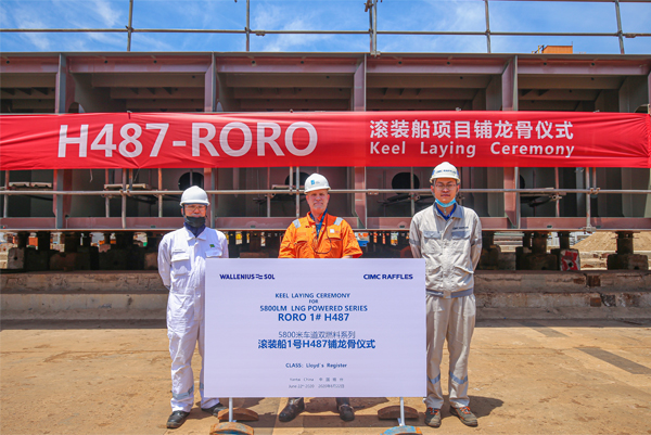 2020年6月22日上午11時,由中集來福士為瑞典航運巨頭Wallenius SOL公司建造的世界最大的5800米車道雙燃料冰級滾裝船2+2系列的第一艘H487項目的鋪龍骨儀式在煙臺基地如期舉行。船東方代表、勞氏船級社負責人、外包商、煙臺基地代表及項目團隊人員出席了本次儀式,共同見證了該首艘滾裝船在3月30日生產開工后,邁入更加全面高效的生產新階段。