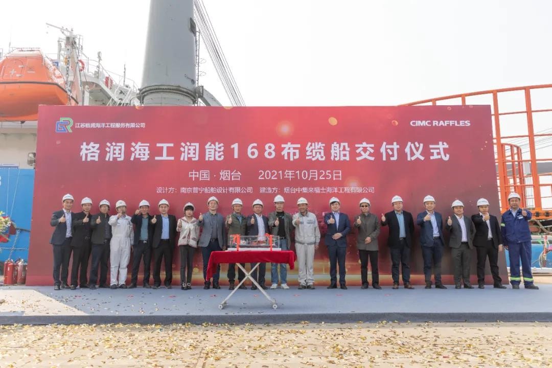 2021年10月25日上午,由南京普寧船舶設(shè)計(jì)有限公司承擔(dān)設(shè)計(jì),中集來(lái)福士海洋工程有限公司負(fù)責(zé)改造的江蘇格潤(rùn)海洋公司服務(wù)有限公司“潤(rùn)能168”布纜船在中集來(lái)福士煙臺(tái)建造基地完成交付。船東方江蘇格潤(rùn)海洋公司服務(wù)有限公司和其母公司格潤(rùn)國(guó)際控股代表,中國(guó)船級(jí)社煙臺(tái)辦事處、中集來(lái)福士等相關(guān)單位領(lǐng)導(dǎo)出席了本次儀式。